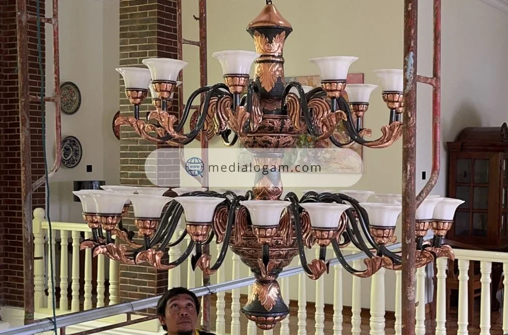 Dalam Analisis Teknis Lampu Gantung Robyong, pusat kekuatan struktural terletak pada tiang tengah atau center post. Komponen ini umumnya menggunakan pipa besi seamless atau hollow galvanis dengan standar ketebalan setara SCH 40. Fungsi utamanya adalah menahan seluruh beban tarik vertikal yang dihasilkan oleh massa lampu dan ornamen cabang. Tanpa struktur ini, distribusi beban menjadi tidak stabil dan menyebabkan distorsi lingkar radial.