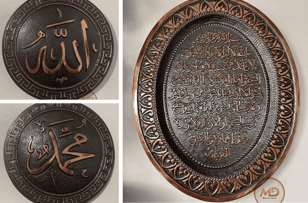 Kaligrafi jumbo berbahan tembaga dikenal memiliki karakter warna hangat dan kesan klasik. Banyak masjid besar memesan karya tembaga custom melalui pengrajin profesional seperti yang ditampilkan pada halaman kerajinan tembaga. Untuk tampilan lebih modern, kaligrafi kuningan dengan finishing doff atau hairline sering diaplikasikan di hotel syariah dan lobi gedung.